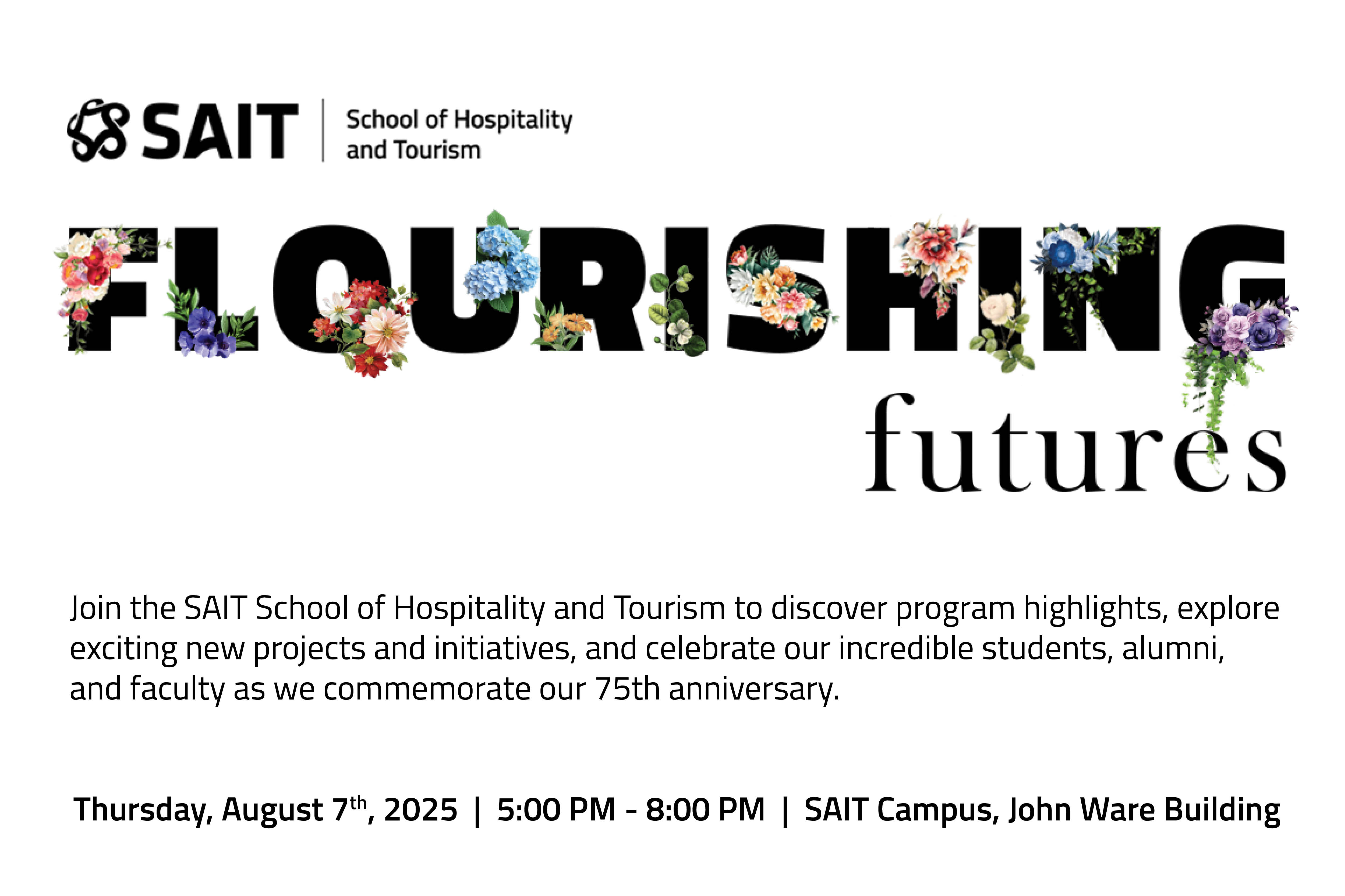 The SAIT School of Hospitality and Tourism invites you to join us for Flourishing Futures – a networking event, open house, and opportunity to connect with program supporters and community leaders in hospitality, tourism, and the culinary arts.