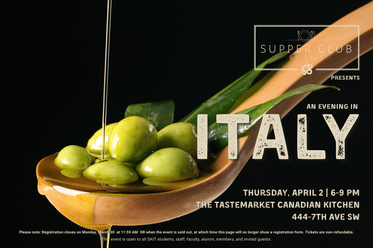 Students of SAIT’s School of Hospitality and Tourism are thrilled to announce and invite you as their guests to attend An Evening in Italy! Join us at The Tastemarket Canadian Kitchen on Thursday, April 2 6PM – 9PM for a student event showcasing the culture and cuisine from Spain.